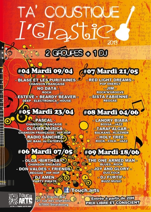 Le principe des soirées « TA’Coustique » est simple : deux groupes issus de différents styles (chanson française, rock, reggae…) se produisent deux mardis par mois dans le caveau de l’Elastic Bar, puis un DJ set est aux platines pour clore la soirée.