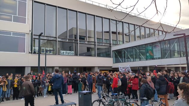 À l’appel de l’Assemblée générale étudiante, environ 300 personnes se sont réunies devant le Patio à 16h, ce jeudi 16 mars. Une heure plus tôt, Élisabeth Borne annonçait l’utilisation de l’article 49.3 pour contourner le vote des députés et adopter en force le texte sur la réforme des retraites.