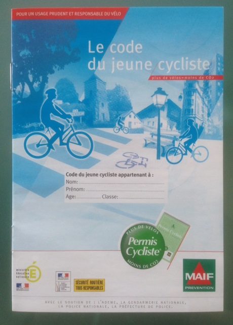 Depuis quelques années, au Cours Moyen, mes élèves ont l’occasion de préparer le « Permis cycliste » en vue de participer à une randonnée en juin. Une première épreuve théorique se déroule en classe : lecture de panneaux, connaissance des règles de priorité et de sécurité en 30 questions. Suivent quelques jours plus tard des épreuves techniques dans la cour de l’école : freinage, guidage, changement d’allure, adaptation aux autres… J’organise pour finir un circuit urbain encadré par des personnes de l’Education Nationale. Le comportement des élèves est observé en situation de « trafic ». A la suite de ces trois épreuves, l’enfant obtient son permis.