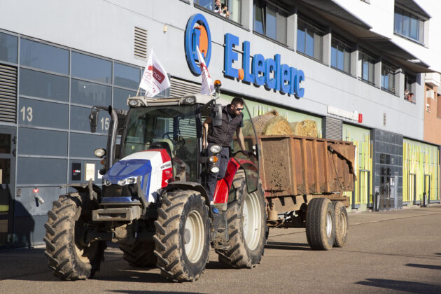 « C’est pas qu’on a perdu l’année dernière, c’est qu’on n’a pas gagné », résume Jérôme, des Jeunes Agriculteurs. Accompagné d’une centaine d’agriculteurs de son syndicat et de la FDSEA (syndicat majoritaire), le salarié agricole Wissembourgeois manifeste devant le centre commercial de Rivetoile à 14h, ce mercredi 9 février. Une cinquantaine de tracteurs venus notamment de Brumath et de Truchtersheim sont stationnés devant l’enseigne Leclerc, accusée par les agriculteurs de négocier des prix trop bas pour permettre une rémunération suffisante pour eux.