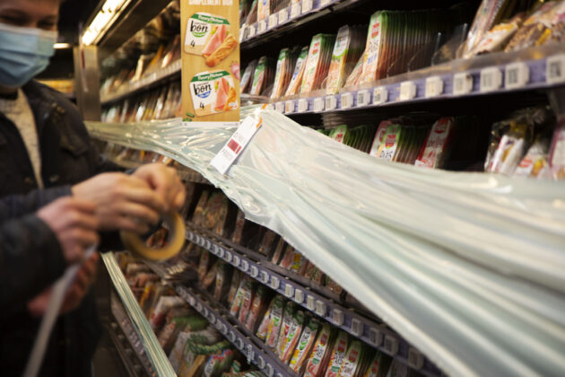 Armés d’étiquettes et de bâches, les agriculteurs ciblent surtout les produits qui ne respectent pas les prix des agriculteurs locaux. Gauthier Kempf pointe un paquet de jambon premier prix dans le rayon :