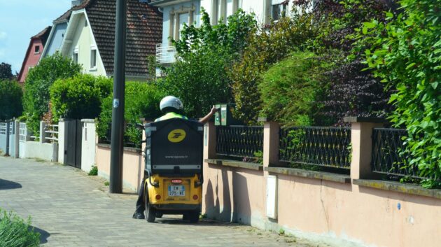 En 2015, La Poste présente au public le Staby, son « nouveau véhicule de distribution écolo », élaboré en partenariat avec Ligier. Cette moto électrique sur trois roues est pratique, se gare rapidement et permet d’emporter plus de courrier que les scooters. Mais les facteurs doivent l’arrêter sur la route et faire le trajet jusqu’aux boites aux lettres à pied. Contrairement aux vélos, ils ne peuvent pas poser l’engin sur les trottoirs puisqu’il s’agit d’un engin motorisé. Dans l’Eurométropole de Strasbourg, le Staby est utilisé lors de tournées péri-urbaines, pour desservir les lotissements de communes comme Ostwald, Lingolsheim ou Entzheim.