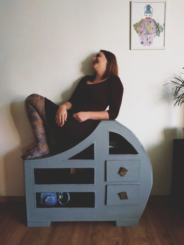 Camille a grandi à Epernay, près de Reims. Le premier studio dans lequel elle avait emménagé était non meublé. Jeune bachelière fraîchement débarquée sur le marché du travail, elle cherche alors une alternative aux meubles neufs, trop chers, trop encombrants, trop pénibles à déplacer. C’est sur internet qu’elle découvre les meubles en carton. Forte de quelques heures de tutoriels sur Youtube, elle décide de fabriquer les siens. Ainsi naissent ses premiers meubles de rangement, sa table basse…