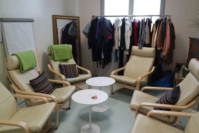 L’entrée donne sur la salle principale, une cafétéria, ce qui donne un sentiment bienvenu de convivialité dans cet univers clinique, austère et froid. On y trouve plusieurs tables, un bar, à boire et à manger. Les salles de consommation de drogues se trouvent derrière.
