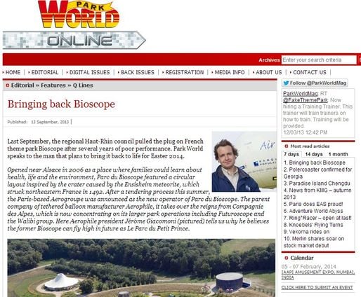 Repris à la Compagnie des Alpes par Aérogroupe, le défunt parc du Bioscope va rouvrir au printemps en tant que Parc du Petit Prince, du nom de l’œuvre d’Antoine de Saint-Exupéry. Dans une interview à Park World Online, une publication (en anglais) spécialisée sur les parcs de loisirs, le président d’Aérogroupe, Jérôme Giacomoni explique comment il compte faire pour transformer le ratage monumental du bioscope en un succès avec le Petit Prince.