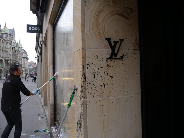 Dans la matinée du mardi 7 mars, la boutique de luxe Louis Vuitton était recouverte de peinture noire. Le slogan « Ni patrie, ni patron, ni patriarcat » y a été tagué. L’épicerie fine Maison Artzner, notamment spécialisée dans le foie gras, a aussi été salie.