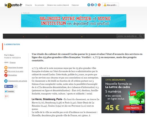 La Gazette des communes publie les résultats d’une étude de Lecko sur l’état de l’administration électronique en France (e-administration). Lecko a analysé les procédures administratives destinées aux citoyens (inscrire son enfant à la cantine, demander une carte d’identité…) dans 25 villes et les a classées de 0 (pas d’information en ligne) à 5 (procédure entièrement dématérialisée avec paiement électronique) :