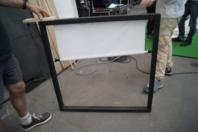 Au bout du hangar, en dessous d’un grand échafaudage de chantier, les élèves roulent et déroulent un tissu de presque quatre mètres de hauteur sur une perche elle-même longue de plusieurs mètres.