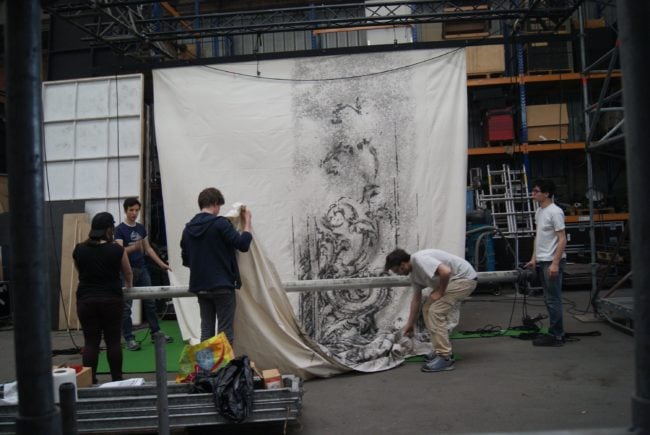 Les gants fixés à la poche arrière du jean et tout en continuant d’enrouler le tissu, les élèves discutent des décors qu’ils ont apprécié récemment. Il est notamment question du décor de Farewell Empire, une pièce montée par leurs aînés de troisième année et présentée au public strasbourgeois dans le cadre de l’Autre Saison, la saison parallèle et gratuite du TNS.