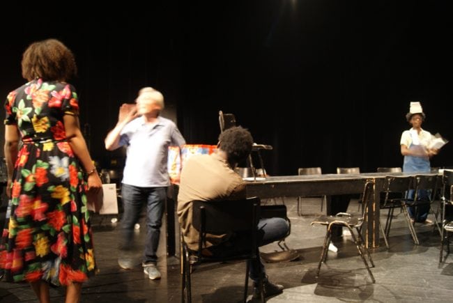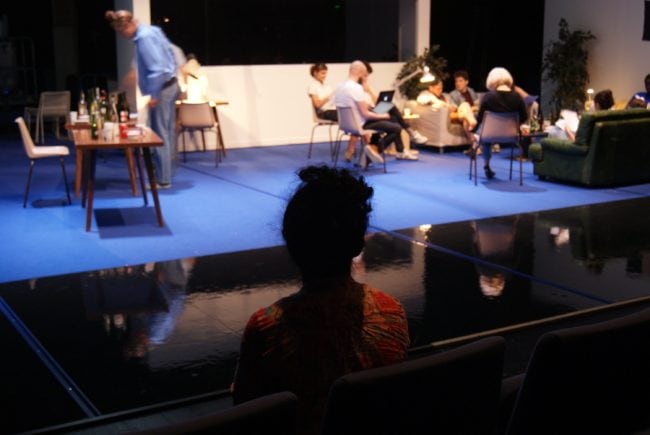 Sur scène, l’auteur, les douze élèves comédiens, le metteur en scène et les deux élèves de la section mise en scène de première année, ses assistants, écoutent la nouvelle monture du texte, l’essayent et l’amendent. Eddy et Ferdinand, élèves en mise en scène, assis parmis les élèves acteurs, ont pour rôle d’assister et de conseiller Julien Gosselin dans sa mise en scène, un rôle pas toujours facile avoue Ferdinand :