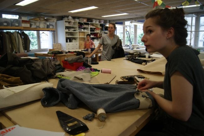 Au même moment, au premier étage, au bout du couloir à droite, plusieurs petites mains s’affairent et vont valser les aiguilles. Dans un mois sera organisé un défilé interne à l’école sur le thème de la première ascension de l’Everest avec la responsable de l’atelier couture, Élisabeth Kinderstuth et le directeur de la section, Pierre Albert. En première année, section scénographie-costume, Clémence assemble un pantalon pour ce défilé dans le cadre de son module « costume historique » :