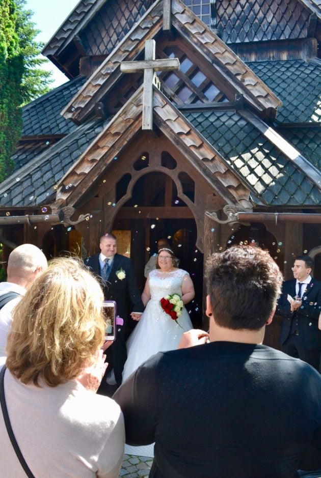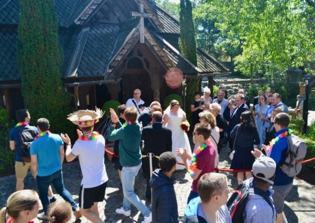 Robe blanche à dentelles et costume bleu, Melanie et Peter sortent de l’église norvégienne sous les bulles de savon soufflées par leurs amis… et sous les applaudissements des visiteurs du parc, mi amusés, mi surpris. Ils sont désormais femme et mari. Chaque saison, une centaine de cérémonies religieuses, catholiques ou protestantes, sont célébrées à Europa-Park : une quarantaine de baptêmes ainsi qu’une soixantaine de mariages et renouvellements de vœux.