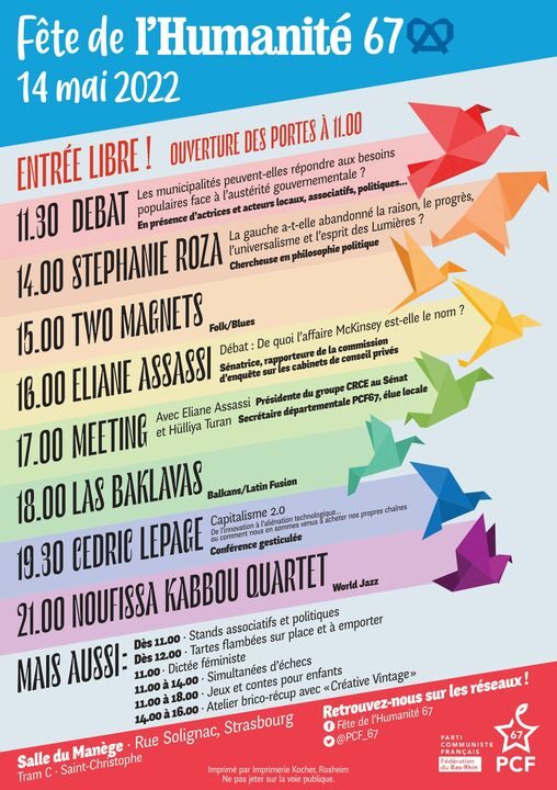 Cette édition de la fête, qui s’est ajustée jusqu’au dernier moment, cherche à être au plus proche de l’actualité politique. Une table ronde pour évoquer la NUPES (Nouvelle Union populaire écologique et sociale) a été ajoutée à 16h. Elle réunira Jean-Marie Brom, de la France insoumise, Jacques Fernique, sénateur écologiste, Linda Ibiem, conseillère régionale socialiste, et Hülliya Turan autour d’une question : La NUPES est-elle le Front populaire du XXIème siècle ?