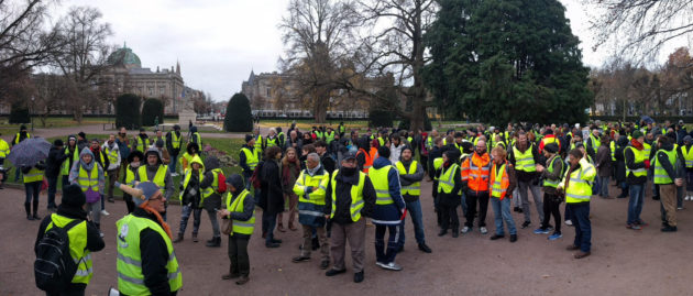 Farid se souvient du gazage de « manifestants pacifistes ». Bientôt quadra, ce père célibataire d’une ado de 12 ans a quitté la semaine précédente son quartier de la Montagne Verte, à l’ouest de Strasbourg pour rejoindre la place de la République où se tient l’assemblée générale des Gilets jaunes de Strasbourg chaque samedi matin, et participer à l’acte VIII du mouvement, avec « trois ou quatre potes », mais sans enfiler le fameux uniforme fluo. Et même s’il en partage le combat, il dit avec sa voix grave « les Gilets jaunes », sans jamais vraiment se compter dedans.