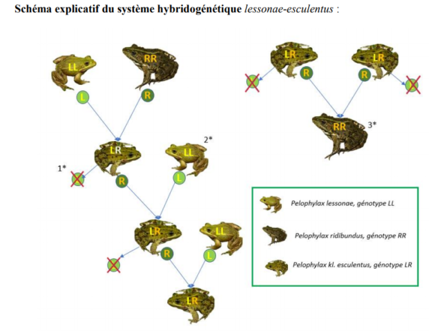 En revanche, lorsqu’une grenouille verte se reproduit avec une grenouille de Lessona, la descendance est une grenouille verte. La grenouille de Lessona transmet son génome et la grenouille verte transmet celui de la grenouille rieuse : c’est l’hybride. Donc logiquement, si la grenouille verte est présente dans un milieu, on peut affirmer que la grenouille de Lessona l’est également. Si la grenouille de Lessona est absente, et que la grenouille verte ne peut que se reproduire avec la grenouille verte ou la grenouille rieuse, la descendance est forcément une grenouille rieuse. Impossible qu’une population de grenouilles vertes se maintienne sans la présence de la grenouille de Lessona.