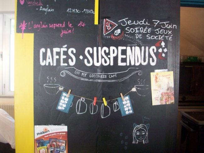 Car rien n’indique à l’extérieur que l’initiative existe, seul un panneau à l’intérieur, derrière la caisse, porte l’inscription de cafés et plats suspendus.
