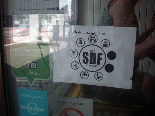 « On a mis l’autocollant Zéro SDF, mais cela ne marche pas trop chez nous. En fait, cela fait longtemps qu’on offre gracieusement un café, un sandwich, l’accès aux toilettes ou la possibilité de charger son téléphone. L’idée est que les personnes SDF aient un endroit où se réchauffer l’hiver. »