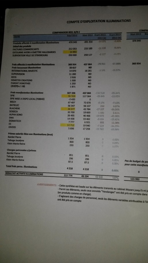 Finalement, le compte d’exploitation des Illuminations 2013 commandé par Michel Pirot tombe aux oubliettes. Pour justifier de l’utilisation de l’intégralité de la subvention municipale de 300 000 euros, le cabinet d’expertise comptable Mazars établit un an et demi plus tard une nouvelle version du document justifiant de 110 000 euros de frais généraux associatifs alloués à l’opération. Soit à peu de chose prêt le montant du bénéfice identifié dans le premier document.