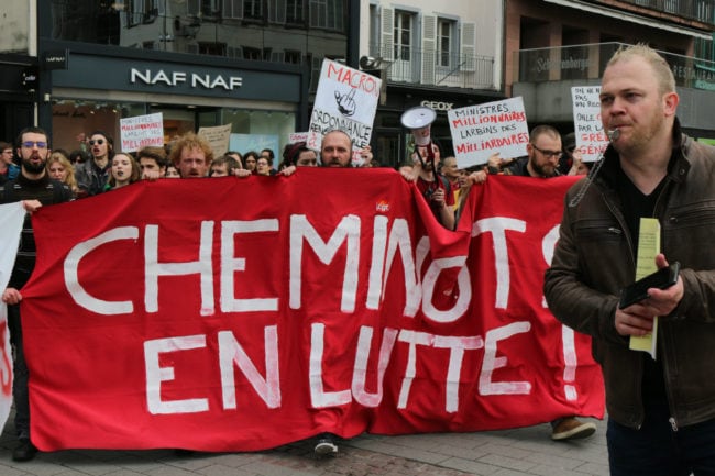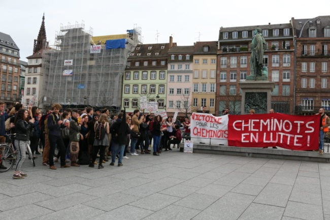 « Nous sommes tous ensemble contre le gouvernement Macron, contre la précarisation dans le milieu hospitalier et les EHPAD, la baisse des retraites. Ensemble, les étudiants concernés par la sélection et les cheminots qui se font attaquer de toutes parts. » Un étudiant brandit un microphone, mardi 3 avril aux alentours de 15h, place Kléber à Strasbourg.