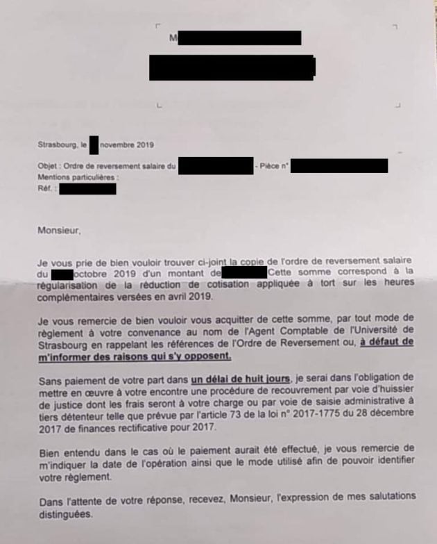 Julie (le prénom a été changé) a aussi reçu les courriers du service comptabilité de l’Université de Strasbourg. Elle doit rendre 60 euros à l’Unistra. Choquée par la menace d’une intervention d’un huissier, Julie dénonce l’absence de compréhension de l’administration vis-à-vis des vacataires :
