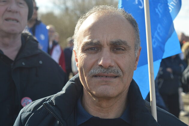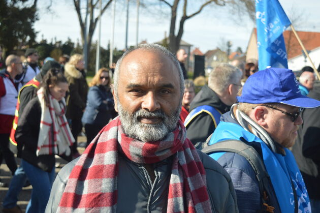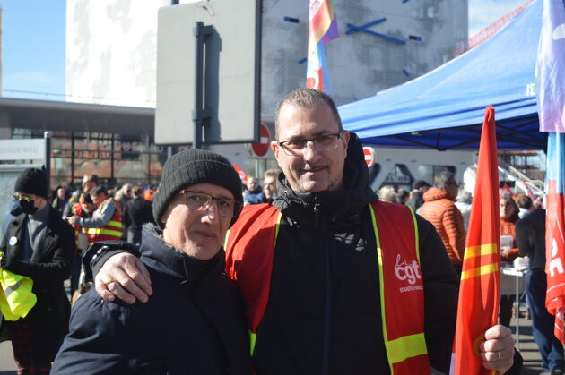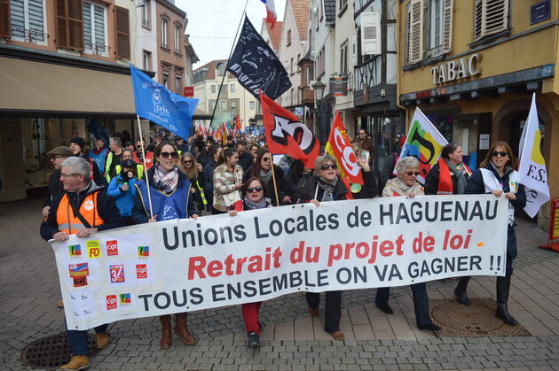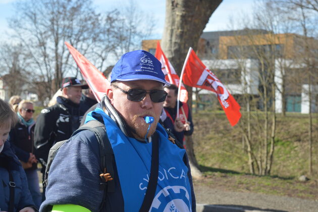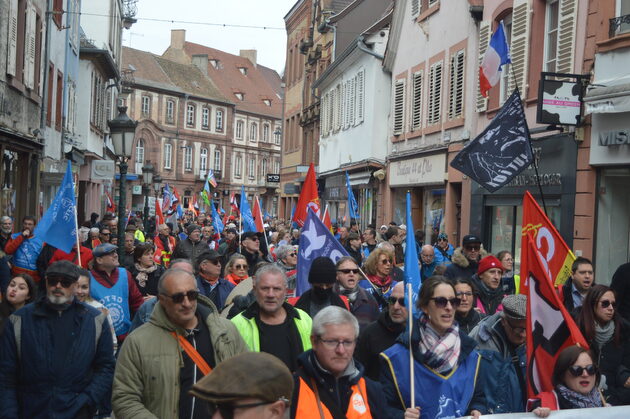 Place de la gare à Haguenau, un peu moins d’un millier de personnes se rejoignent sous le soleil samedi 11 mars. « Le 21 février, on était 2 000. C’était la plus grande manifestation de l’histoire de la ville. Aujourd’hui on s’en rapproche », analyse Emmanuel Printz, président de l’union départementale de la CFTC et ouvrier chez Siemens, une usine située à quelques centaines de mètres.