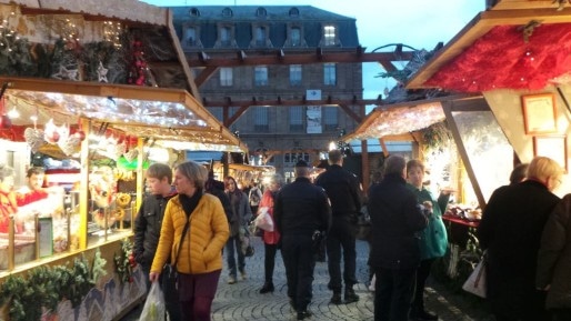 Autour de la place du Marché-aux-Cochons-de-Lait, l’ambiance de Noël nous gagne enfin. Pas un policier à l’horizon, les odeurs de vin chaud et la décoration des magasins l’emportent, sur le court chemin qui mène au marché de la Cathédrale. Mais très vite, l’uniforme refait son apparition, entre les chalets.