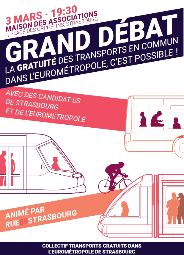 Le collectif pour la gratuité des transports organise un débat sur son thème de prédilection mardi 3 mars à 19h30 à la Maison des associations. Pour en discuter, il invite 3 candidats aux élections municipales à Strasbourg ainsi que trois candidats des communes d’Illkirch-Graffenstaden, Schiltigheim et Holtzheim.