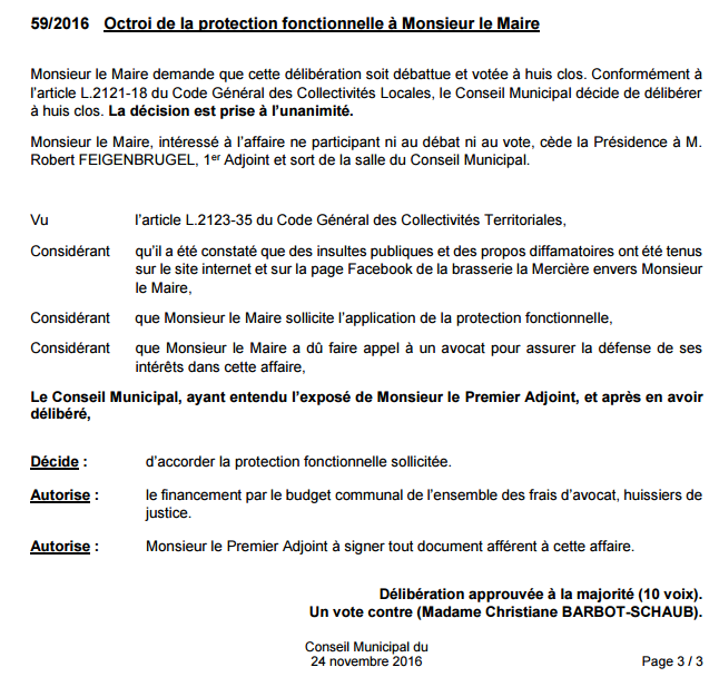 Puis jeudi 24 novembre, Jean-Luc Herzog a fait voter par son conseil municipal, à huis clos, une délibération lui permettant de faire couvrir ses frais de justice personnels par la mairie :