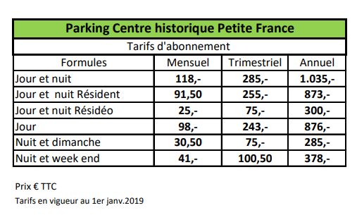 Ce prix avantageux de 25 euros par mois correspond à l’offre « Résidéo », lancée en 2013 d’abord au tarif de 39 euros. Elle est réservée aux habitants de la Grande-Île et ne s’applique que pour un seul véhicule par foyer au parking Petite France ou au P3 des Halles. L’objectif est de réduire la pression sur les places en voirie dans le centre touristique, de plus en plus piétonnisé. La politique tarifaire est votée par les élus de la Ville de Strasbourg et appliquée par Parcus, la société publique-privée délégataire de ces deux parkings.