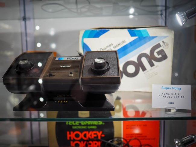Dans la première pièce, on découvre l’anatomie des premières machines puis une salle est remplie de consoles de l’un des premiers jeux vidéos installés sur les écrans domestiques, le jeu de « tennis » Pong, avec ses célèbres traits blancs et sa balle carrée (1976).