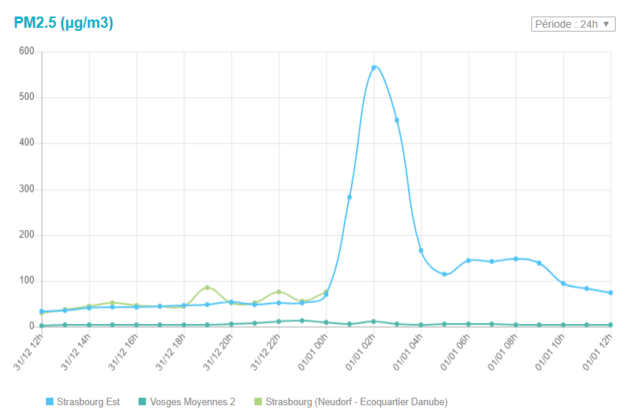 Selon les relevés d’Atmo Grand Est, la pollution aux particules PM 2,5 a été multipliée par 14 sur la seule station fonctionnelle par rapport aux données observées dans l’après-midi. À « Strasbourg-Est », la concentration est ainsi passée de 40µg/m3 à 14h à 565 µg/m3 à 2h. Les mesures pour la nouvelle station au quartier Danube s’arrêtent à 19h.