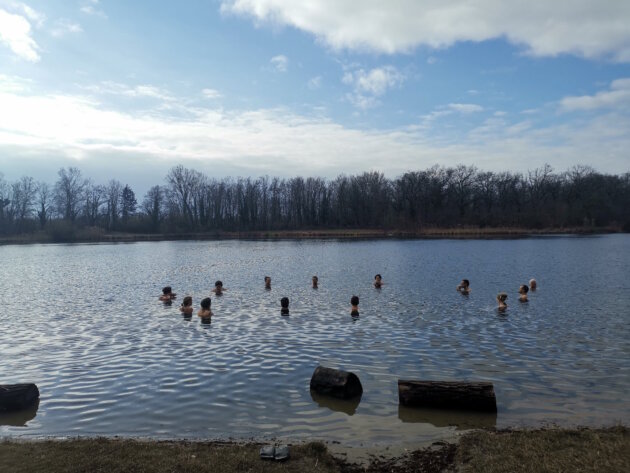 « On y va ensemble ? On forme un cercle dans l’eau », lance François. Cette fois-ci j’ai chaussé des claquettes car je me souviens de la sensation terrible de la terre gelée sous les pieds.
