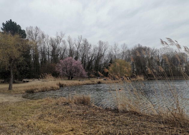 Derrière nous, la buvette où l’été les baigneurs de cette gravière naturiste font la queue pour acheter leur bière. Deux saisons, deux ambiances. Soudain, le soleil émerge de derrière un nuage, lui aussi a dû avoir du mal à se lever même si nous sommes le premier jour du printemps. Les rayons UV réchauffent immédiatement les corps un peu figés par le froid et donnent du courage.