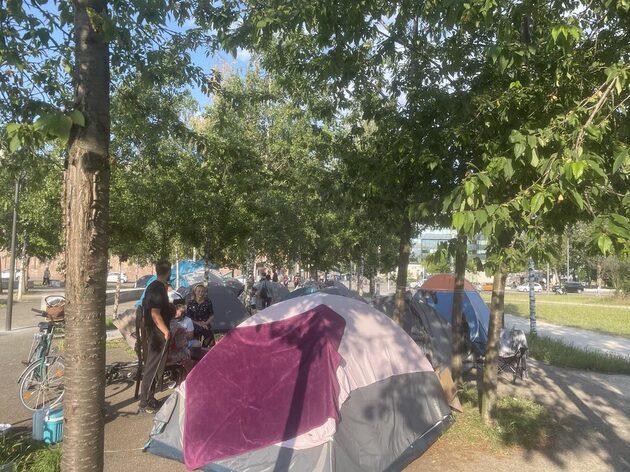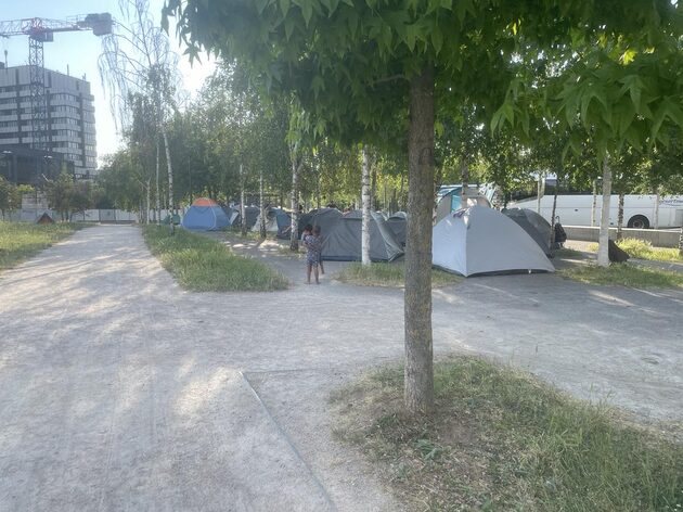 Mercredi 7 juin, 21 tentes accueillent une cinquantaine de sans-abris. Dans certaines, dorment jusqu’à six personnes. Autour de salons improvisés, sous les arbres, les femmes, les hommes et les enfants se regroupent en fonction de leur langue maternelle. Pour la plupart, l’albanais ou le dari (variété de persan parlé en Afghanistan). Les parents veillent sur les petits qui jouent au foot à côté des tentes, des passants qui attendent leur bus et des cars de tourisme aux immatriculations venues de toute l’Europe.