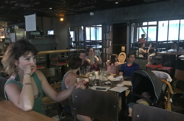 À 17h30, quelques parents sont déjà installés à l’Artichaut. Ils sont réunis autour d’une grande table et sirotent des boissons rafraîchissantes. La projection du conseil municipal a débuté, mais l’interpellation ne sera évoquée qu’en fin de séance, a minima après 20h. Les participants regardent la montre et l’ordre du jour imprimé pour s’organiser.