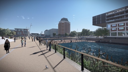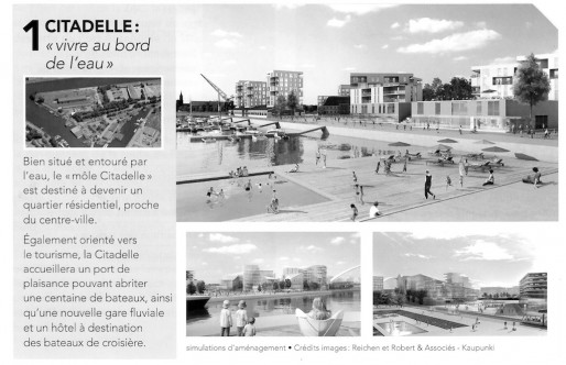 Renseignement pris, Bernard Reichen, architecte et urbaniste à qui le maire Roland Ries a confié une étude prospective sur le futur quartier Deux-Rives, a placé une piscine flottante sur l’un des visuels de présentation de son étude (ci-dessus, extrait du document distribué pendant la concertation d’octobre-novembre 2013). Mais il ne s’agirait là que d’une « insertion esthétique » sans projet concret derrière, d’après le service de presse de la ville et de la CUS. Peut-être un jour donc, mais c’est loin d’être encore dans les tuyaux.