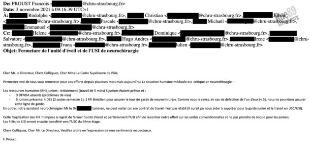 « La situation humaine médicale est critique en neurochirurgie. » Le chef du service neurochirurgie des Hôpitaux Universitaires de Strasbourg (HUS) s’adresse à ses supérieurs et collègues en ces termes dans un mail daté du mercredi 3 novembre, dont Rue89 Strasbourg a obtenu une copie (voir ci-dessous).