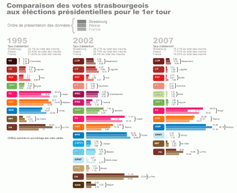 Sarkozy, Royal, Bayrou : en 2007, l’ordre d’arrivée des grands candidats au premier tour à Strasbourg correspondait aux résultats nationaux. Les Strasbourgeois ont toutefois plus voté pour François Bayrou que les Français (22,36% contre 18,57%) et moins pour Jean-Marie Le Pen (8,09% contre 10,44%).
