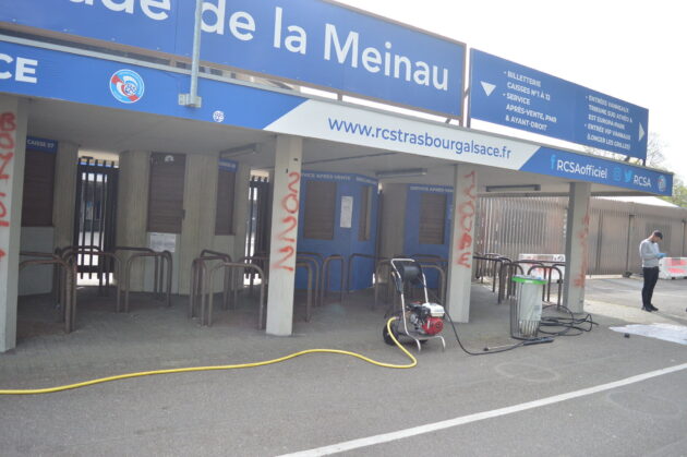 Des employés de l’entreprise de nettoyage Onet et du Racing Club de Strasbourg s’affèrent autour du stade de la Meinau pour effacer des dizaines de tags en cette matinée du vendredi 29 mars. Dans quelques heures, plus de 25 000 supporters afflueront pour assister au match Strasbourg-PSG, club détenu par Qatar Sports Investments.
