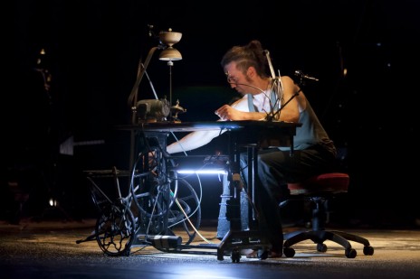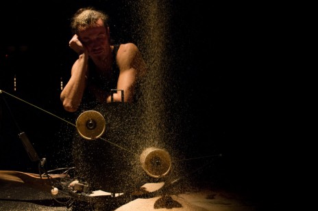 L’espace délimité par la sciure, où le jongleur est encore véritablement jongleur, ne cesse de se rétrécir. D’abord l’artiste s’attable, c’est un artisan qui fait tourner un pédalier. L’espace de sciure se rétrécit encore. Le jongleur est maintenant figé sur une plateforme à roulettes, figurine de boîte à musique grandeur nature. Enfin, les diabolos tournent tout seuls, ils se sont émancipés de leur jongleur. Lui mange des chips, il n’est plus que spectateur. Même la musique se fait d’elle-même, alors la pianiste fait une sieste… Est-ce drôle ou tragique ? Inlassablement, la machine tourne avec son ronflement obsédant.