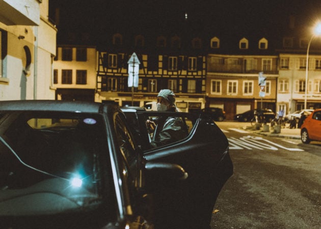 Assise sur une serviette de bain, elle sort d’un vide-poche deux masques FFP2, comme le sien, qu’elle nous tend. « Vos masques chirurgicaux protègent surtout les autres. Ceux-là vous protègent vous également », explique t-elle entre deux conseils sur la manière de bien les mettre. Dernier check up. Elle glisse in extremis une bouteille de gel hydro-alcoolique à côté d’elle et peut enfin partir dans la nuit.