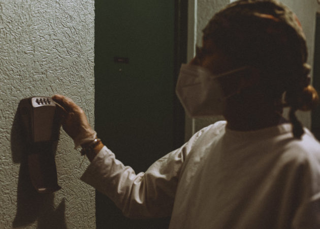 D’une main, elle rajuste son calot en tissu coloré. « C’est du batik que j’ai ramené d’Indonésie. Si j’avais pensé que ça me servirait à ça… C’est une amie qui me l’a cousu sur un modèle de bloc. » Depuis le début de l’épidémie, elle ne s’en sépare plus. « Ça évite les projections dans les cheveux ». Elle a également ressorti son uniforme d’étudiante des placards, et noué par dessus, dans le dos, une blouse en coton épais qu’elle peut faire bouillir. « Je l’enlève devant la porte avant de rentrer chez moi », explique t-elle. Plus que de tomber malade, ce qui la terrifie, ce serait de contaminer ses proches :
