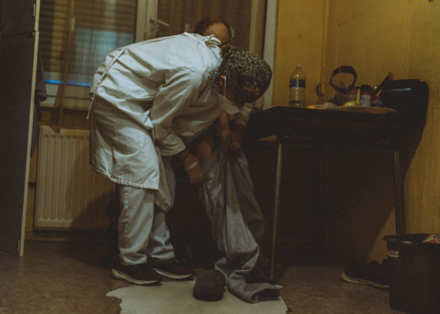 7h12, dans un bloc voisin. Élise vient réveiller Jean-Marc (le prénom a été modifié) et prendre sa glycémie. L’homme souffre de troubles cognitifs. L’infirmière s’engouffre dans la cuisine et glisse une tasse dans le micro-onde. Sans un regard pour le papier peint déchiré partout sur les murs, elle attrape une clémentine, un petit pain et découpe un kiwi. « Préparer le petit-déjeuner, ça n’entre pas dans nos attributions mais on le fait quand même », explique t-elle en aparté. Tout petit pas après l’autre, en traînant des pieds, Jean-Marc finit par arriver à table. Élise lui enfile des chaussettes aux pieds, puis un pantalon de jogging, avant de partir.