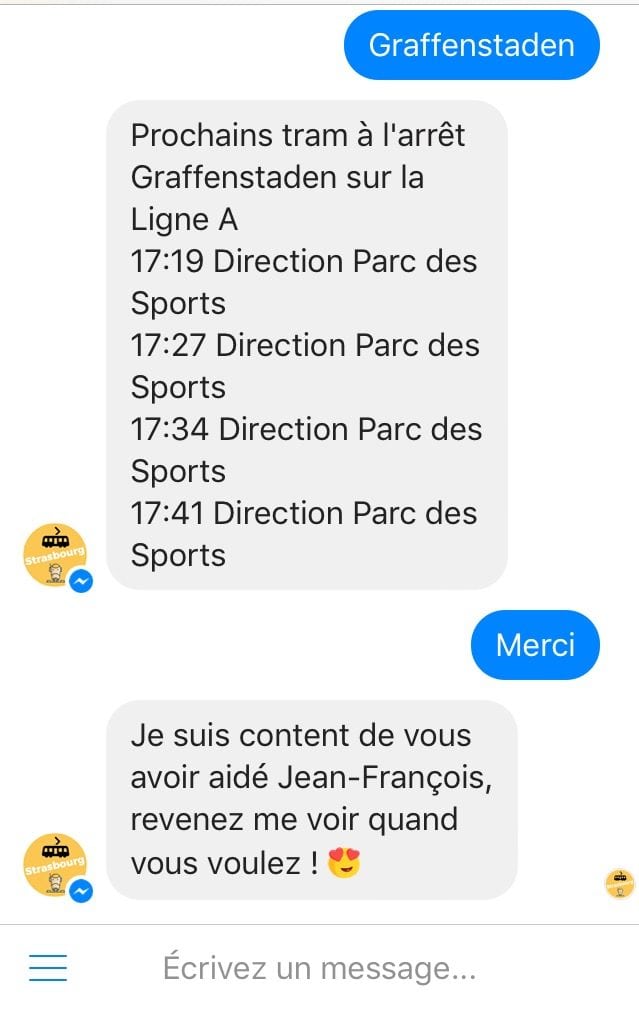 Plus besoin d’aller sur la bonne vielle appli Tramway Strasbourg, le site de la CTS ou pire… marcher jusqu’à l’arrêt et garder le suspense. Depuis le 21 février, un simple message sur Messenger, l’application de messagerie de Facebook à TramBots – Strasbourg et les horaires des quatre prochains trams sur chaque ligne s’affichent instantanément.