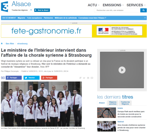 La chorale de la cathédrale grecque-orthodoxe mariamite de Damas (Syrie) pourra-t-elle chanter au festival Sacrées journées en novembre ? Les 20 chanteurs du chœur Saint Ignace se sont vus refuser leur visa par l’ambassade de France à Beyrouth. Leur dossier était jugé « pas fiable ». En pleine mobilisation pour accueillir des réfugiés, l’ancien pasteur et organisateur Jean-Louis Hoffet s’est étonné de la situation à l’AFP, que France 3 Alsace reprend sur son site internet.
