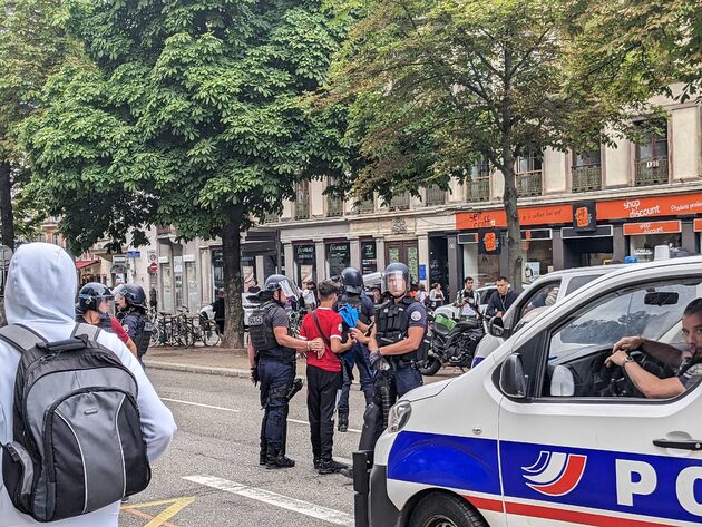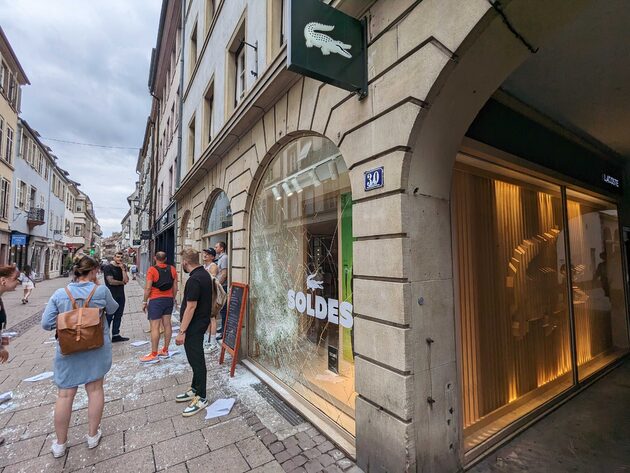 Ambiance inédite au centre-ville, entre bandes d’émeutiers cherchant à piller des magasins et à échapper à la police, policiers qui leur courent après, et des passants qui se retrouvent au milieu, sidérés. Certains jeunes, dont une majorité de mineurs, crient « la police est violente, la police tue… »
