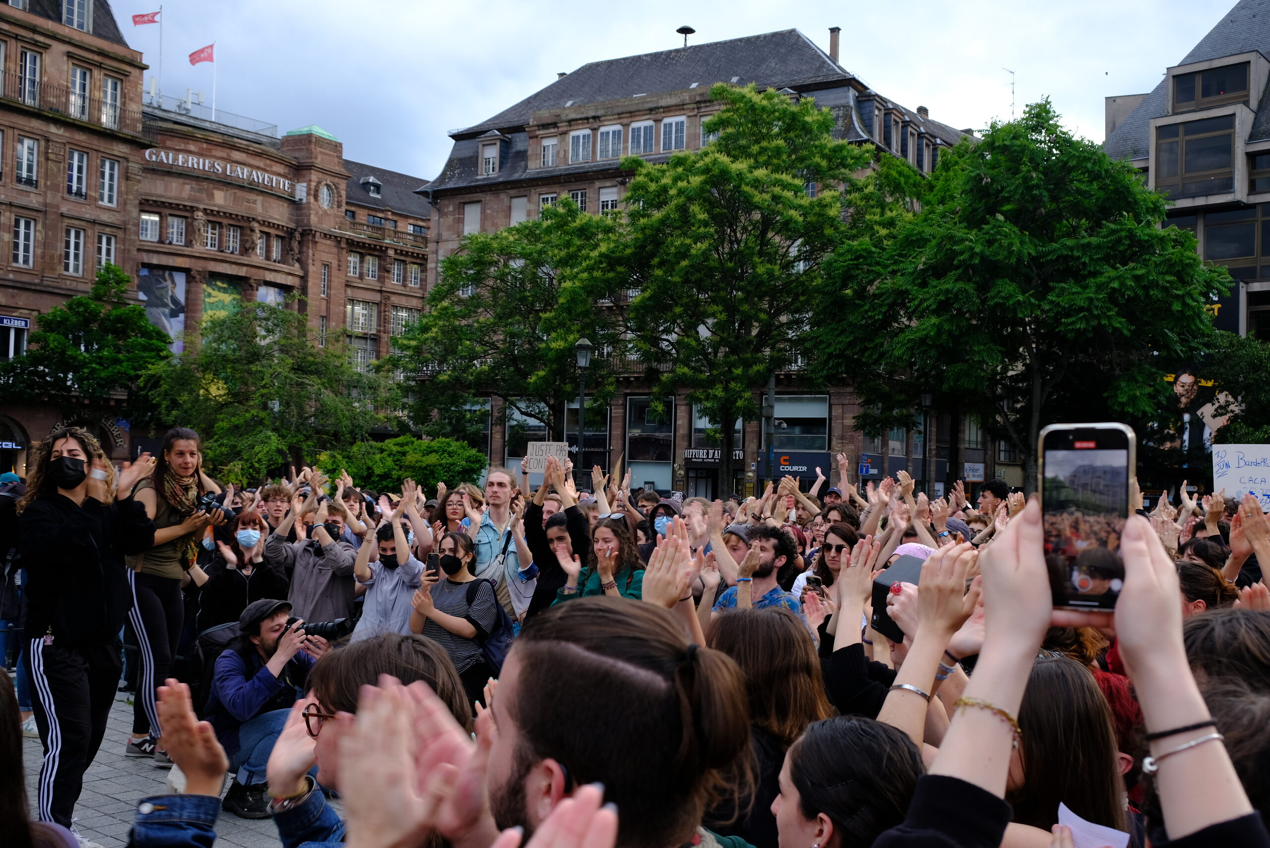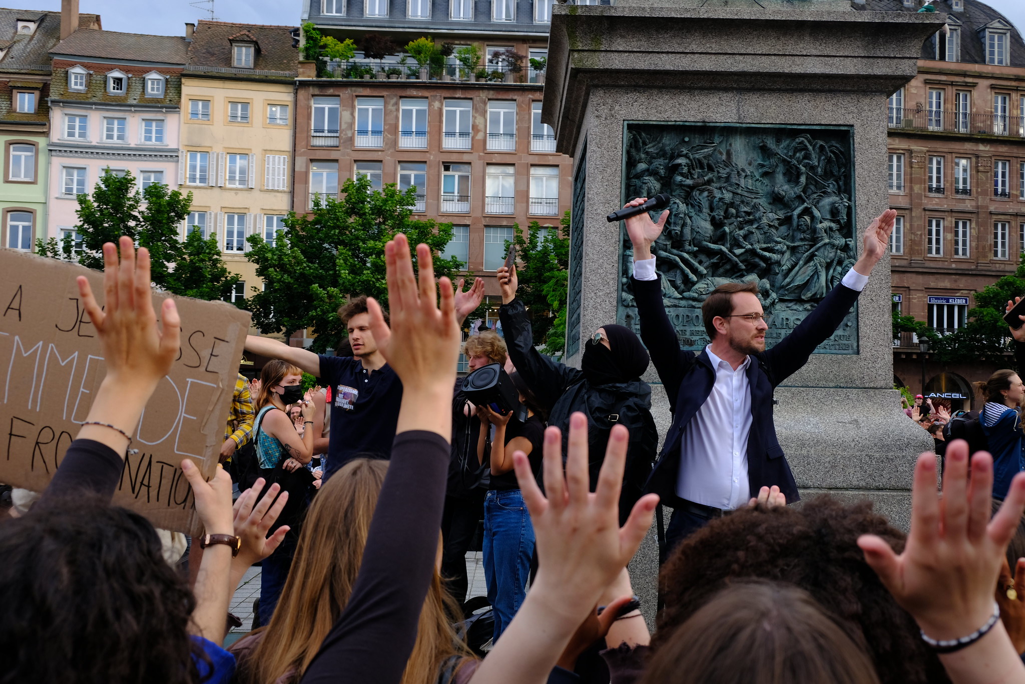 Au pied de la statue du général Kléber, la jeunesse militante prend la parole et porte des combats variés. Une membre de l’Union Communiste Libertaire appelle à manifester contre l’extrême-droite lors de la gay pride ce samedi 15 juin. Puis une étudiante active au sein du collectif Palestine Unistras appelle à maintenir une dimension anti-impérialiste au sein du mouvement.