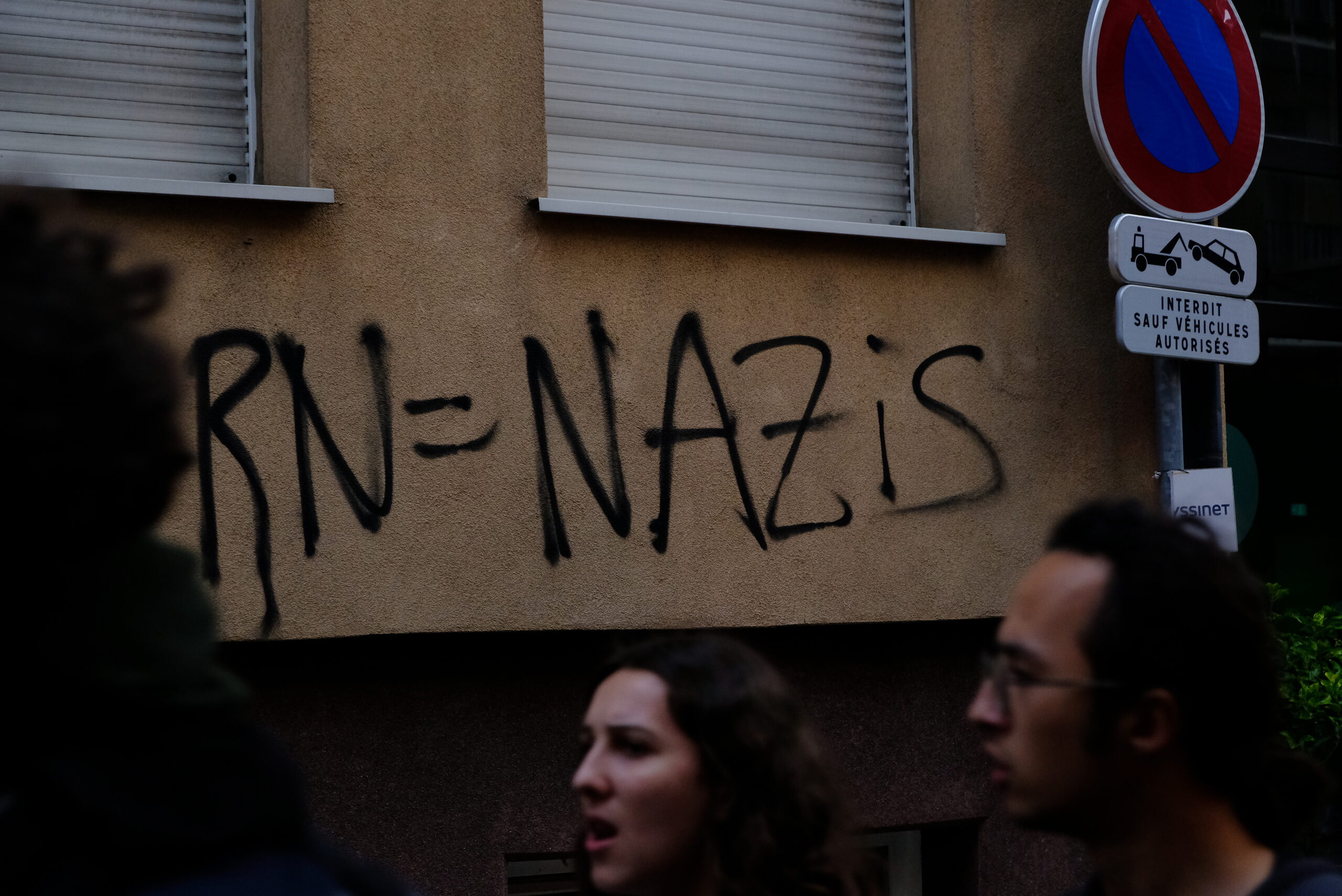 La manifestation bifurque régulièrement, lorsque quelques véhicules de police apparaissent au coin de la rue. Des barrières métalliques et des poubelles sont jetées au sol, des déchets brûlés. Sur les murs, des bombes taguent régulièrement : « RN = nazis ». Trois personnes seront interpellées. Peu après 21h, la manifestation prend fin. Rendez-vous est donné le lendemain 19h place Kléber.