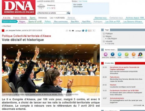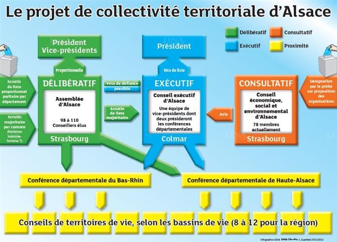 Samedi 24 novembre, les 122 élus des conseils généraux et du régional d’Alsace étaient réunis en congrès à Strasbourg pour voter la résolution proposant au gouvernement de bien vouloir créer une nouvelle collectivité territoriale, regroupant les trois existantes, le Conseil d’Alsace. Le projet qui a abouti des négociations fait apparaître deux assemblées, deux présidents, deux sièges, deux conférences départementales, une dizaine de conseils de territoires… Les DNA ont publié dans un dossier paru le 23 novembre une infographie qui résume bien la future situation institutionnelle de l’Alsace: