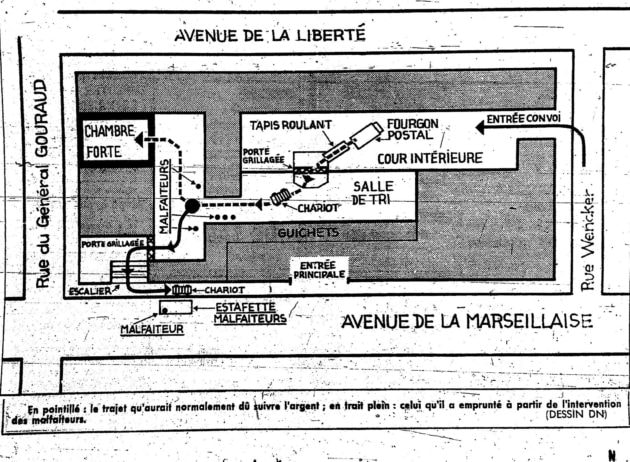 Pour y arriver, les braqueurs se sont simplement déguisés en électriciens. Peu avant 9h, ils ont gagné le couloir qui mène au coffre en prétendant simplement avoir des réparations à faire. Quand les quatre postiers arrivent avec les chariots chargés d’argent liquide, les gangsters n’ont plus qu’à dégainer leurs calibres cachés sous leurs blouses grises. Les employés n’opposent aucune résistance. Les braqueurs sortent tranquillement Avenue de la Marseillaise, par la porte que tout le monde pensait condamnée.